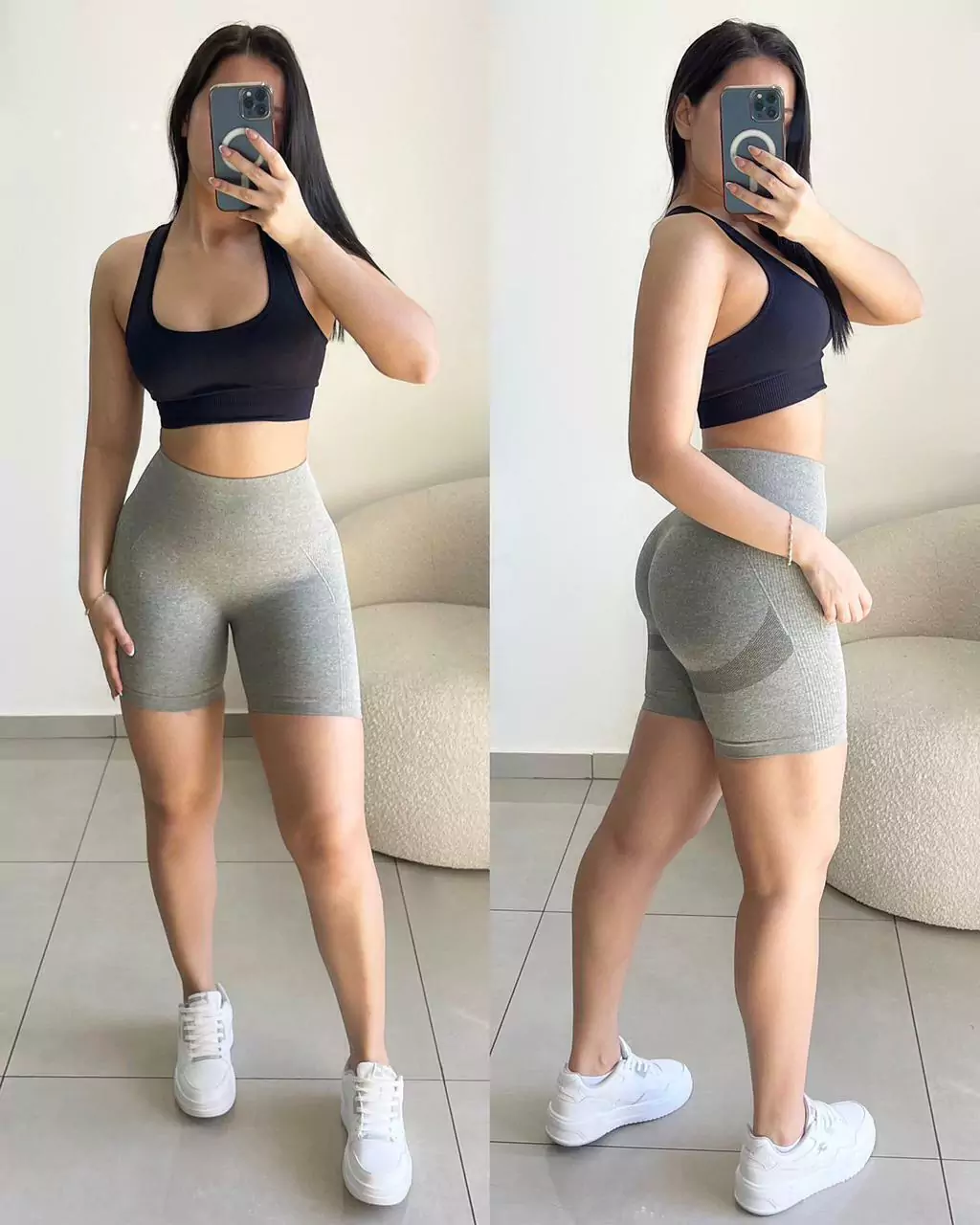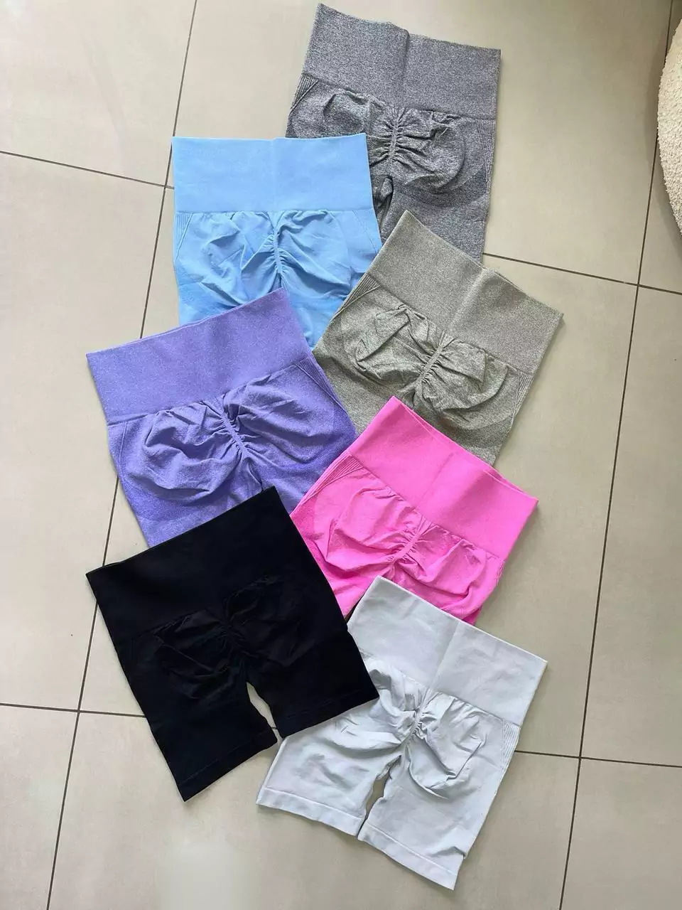 short con frunce, cintura alta, costura para levantar el gluteo y media pierna